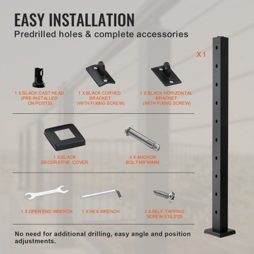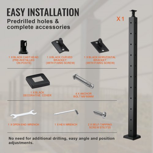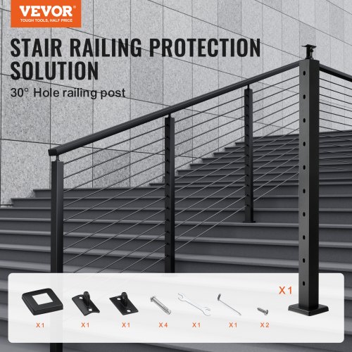 VEVOR Palo per Ringhiera per Cavi, Palo per Ringhiera Ponte, Senza Fori, in Acciaio Inossidabile SUS304, Palo per Corrimano per Scale con Staffa Orizzontale e Curva, Palo Ringhiera Nero 91,4x5x5 cm