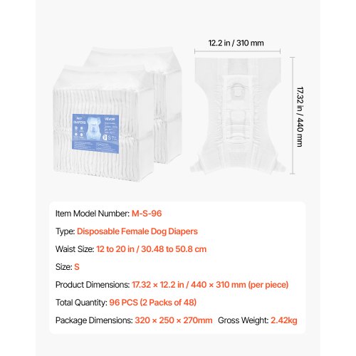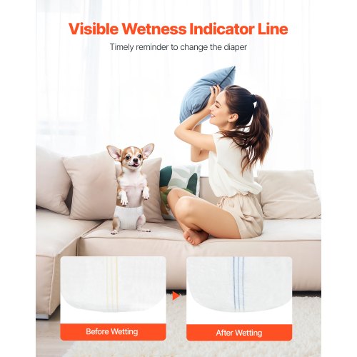 VEVOR Pannolini Monouso per Cani, Super Assorbenti per Cani Femmine, Pannolini a Prova di Perdite a 360° con Indicatore di Umidità per Addestramento, Taglia S, 96 Pezzi, 2 Confezioni da 48