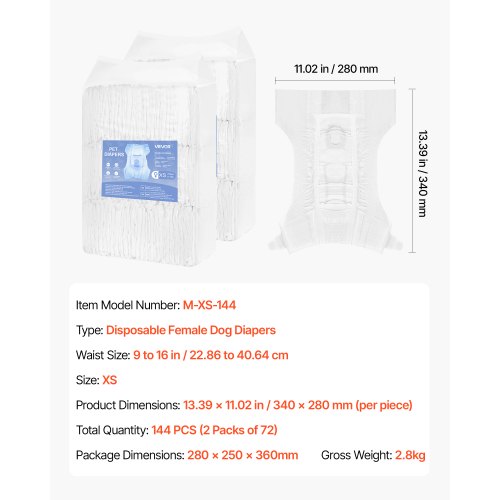 VEVOR Pannolini Monouso per Cani, Super Assorbenti per Cani Femmine, Pannolini a Prova di Perdite a 360° con Indicatore di Umidità per Addestramento, XS, 144 Pezzi, 2 Confezioni da 72