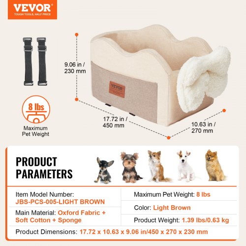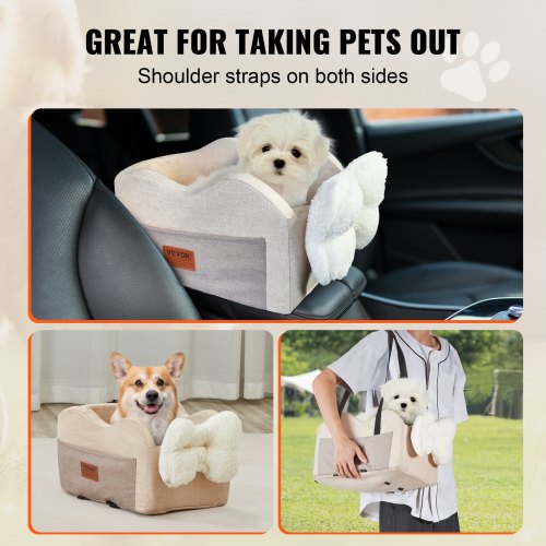 VEVOR Seggiolino da Auto per Cani di Piccola Taglia 8kg, Rialzo per Cani, Guinzaglio con Clip, Cinghie Regolabili, Cuccia per Animali Domestici con Bracciolo Centrale, Marrone Chiaro