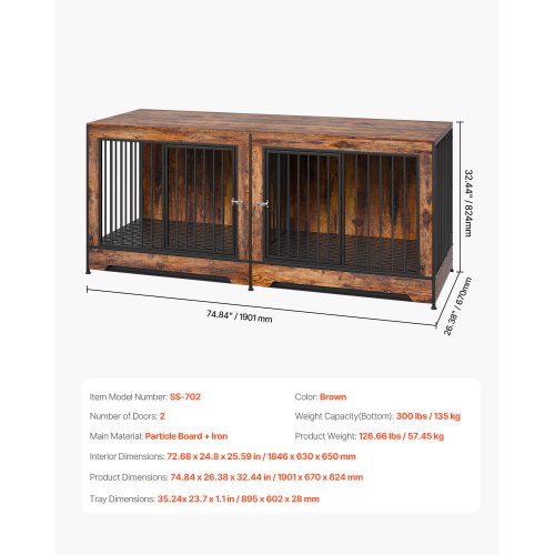 VEVOR Mobile per Cuccia per Cani, Cuccia per Cani Interno con Divisorio Doppie Porte, Vassoio Rimovibile Tavolo in Legno, Multifunzionale Gabbia per Cani di Varia Taglia, Marrone 1901 x 670 x 824 mm