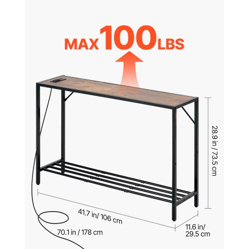 VEVOR Tavolo Stretto Dietro Divano, 106 x 29,5 x 73,5 cm, con Prese di Corrente, Tavolo d'Ingresso Lungo a 2 Livelli con Struttura in Metallo e Stazione di Ricarica, per Ingresso, Corridoio