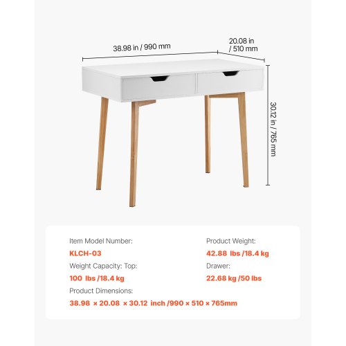 VEVOR Scrivania Piccola con 2 Cassetti, Semplice Tavolo da Studio in Legno per Disegnare, Leggere, Tavolo da Lavoro Rettangolare con Spazio di Archiviazione per Ufficio Domestico, Bianco e Legno
