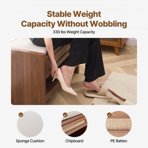 VEVOR Panca in Rattan per Scarpe da 786 mm, Panca da Ingresso con Cassetto Portaoggetti e Cuscino del Sedile in Lino e Rattan Intrecciato a Mano, Panca Boho per Fattoria, Camera da Letto, Soggiorno