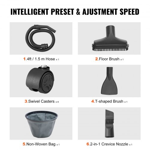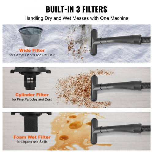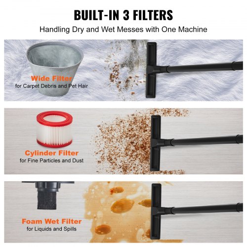 VEVOR Aspirapolvere per umidi asciutti 15 litri, Aspirapolvere portatile commerciale, 5 HP max., Aspirazione con ugello a rotelle, Aspirapolevere per tappeti, detriti, pelianimali domestici, Nero