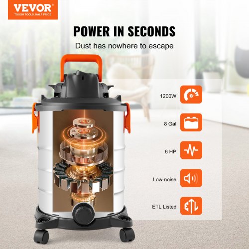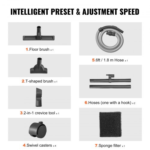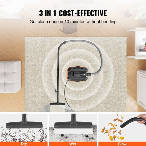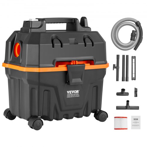 VEVOR Aspirapolvere per liquidi asciutti capienza 18 litri, Aspirapolvere portatile 6 HP max, Aspirazione con ugello, rotelle, per tappeti, detriti, Aspirapolvere peli animali domestici, Arancione