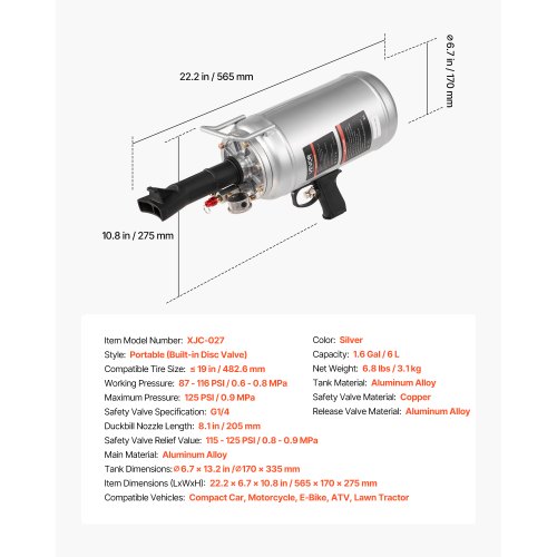 VEVOR Gonfiatore Portatile per Pneumatici, 6 L, Pressione di Esercizio 0,6 a 0,8 MPa, Gonfiatore a Grilletto per Tallone del Pneumatico, per Piccole Auto, Motociclette, Bici Elettriche, Argento
