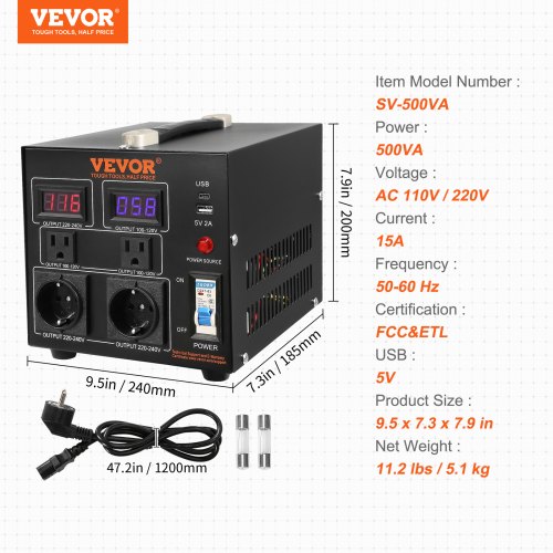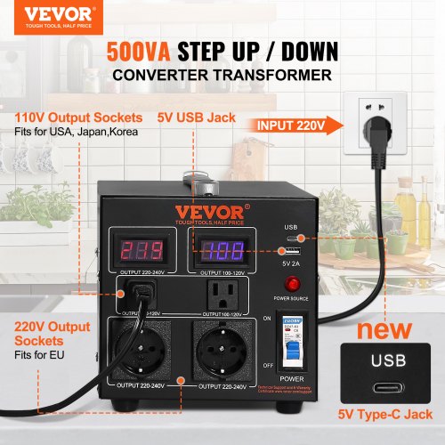 VEVOR Convertitore di Tensione Step Up/Down Portatile 110V-220V / 220V-110V Potenza da 500VA, Trasformatore di Tensione 500VA Portatile 240 x 185 x 200 mm 2 Spine, Convertitore di Tensione 500V USB 5V