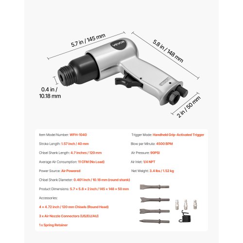 VEVOR Martello Pneumatico 4500 bpm, Scalpello Pneumatico Compatto, Lunghezza della Corsa 4 cm, con 4 Scalpelli da 12 cm, per Tagliare Metallo, Demolire Muri di Cemento, Scalpellare Pavimenti