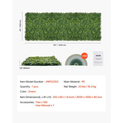 VEVOR Pannelli da Parete in Erba Artificiale da 3000 x 1000 mm Parete Vegetale Artificiale per Decorazioni Verdi per Interni Esterni e Copertura di Recinzioni in Edera, Schermo per Siepi di Sfondo