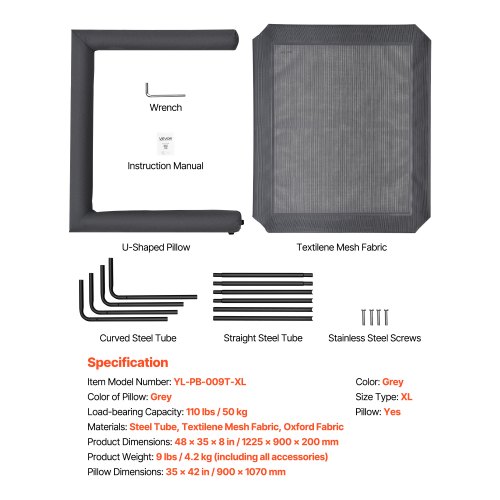 VEVOR Letto Rialzato per Cani per Cani di Grossa Taglia, Lettino Portatile Rialzato per Animali Domestici con Struttura in Tubo di Alluminio e Rete Teslin, per Interni Esterni, Taglia XL, Grigio