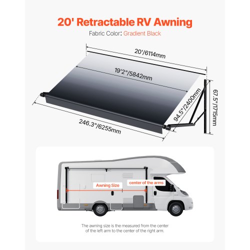 VEVOR Tenda da Sole di Ricambio Impermeabile in Vinile per Camper, Tenda da Sole Retrattile Modulare con Telaio in Lega di Alluminio, Nero Sfumato, Elettrico 6096 mm Adatta Maggior Camper