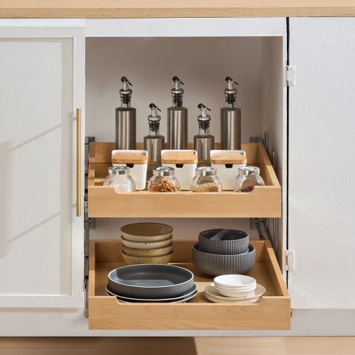 VEVOR Organizzatore Estensibile per Armadio a 2 Ripiani, 315 x 533 mm Ripiano Estraibile per Cassetto con Meccanismo di Chiusura Ammortizzata, Organizzatore per Armadietto Base Regolabile per Cucina