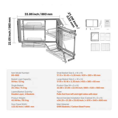 VEVOR Cieco Angolo Estraibile Organizzatore, 2 Tier 4 Ripiani Organizer per Mobile da Cucina, Cestino Portaoggetti in Acciaio al Carbonio Cromato con Apertura a Sinistra Destra 860 x 535 x 560 mm