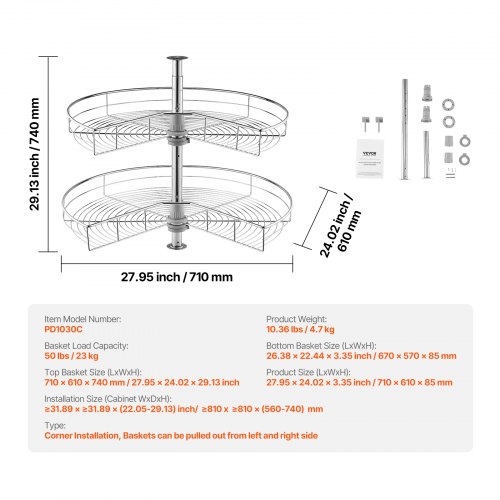 VEVOR Organizer Angolare Cromato 710 mm Forma di Rene, Sngolo Cieco Girevole 360° per Mobiletto Cucina, Ripiano Stoccaggio Regolabile Altezza 2 Livelli, Ripiano in Acciaio Carbonio per Angolo Mobile