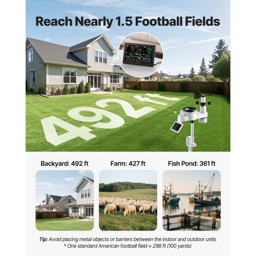 VEVOR Stazione Meteorologica Wi-Fi con APP, Display VA da 190 mm, Sensore Esterno Wireless Alimentato a Energia Solare, Pluviometro, con Termometro per Piscina per Previsioni del Tempo Temperatura