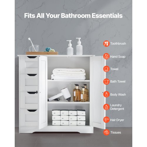 VEVOR Mobiletto da Bagno a 4 Ripiani Autoportante con 2 Ante 4 Cassetti Ripiano Regolabile, Armadietto da Pavimento per Cucina Soggiorno Ingresso, Mobiletto da Cucina Bianco