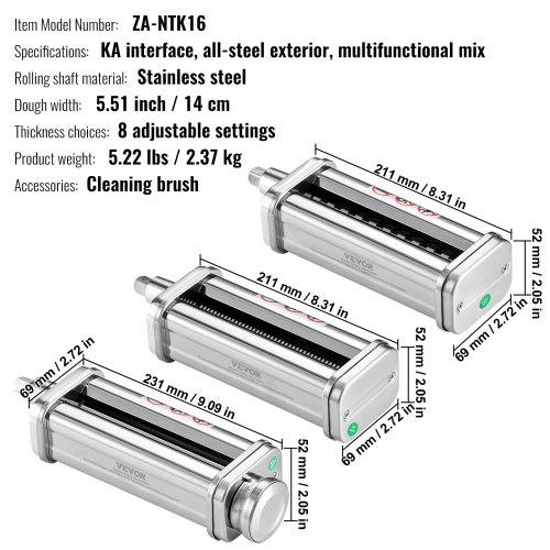 VEVOR Accessorio Rullo per Sfogliatrice di Pasta Adatto per Impastatrice, Rullo di Tagliapasta Acciaio Inox 3-in-1 Compatibile per Robot da Cucina Commerciale Spessore Regolabile 8 Livelli
