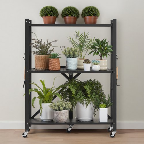 VEVOR Scaffale Portaoggetti Pieghevole a 3 Ripiani con Ruote, Scaffale in Metallo Pieghevole, Robusto Resistente Senza Montaggio, Ideale per Garage, Cucina, Cantina Nero 330 x 760 x 910 mm