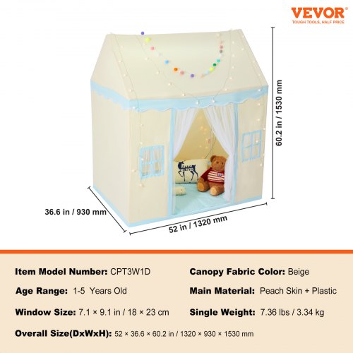 VEVOR Tenda da Gioco per Bambini 1320 x 890 x 1520 mm Tenda per Bambini 1 a 5 Anni, con Tappetino Lampada da Tenda, Finestre per Interni Esterni, Tenda da Gioco per Castello per Ragazzi Ragazze, Beige
