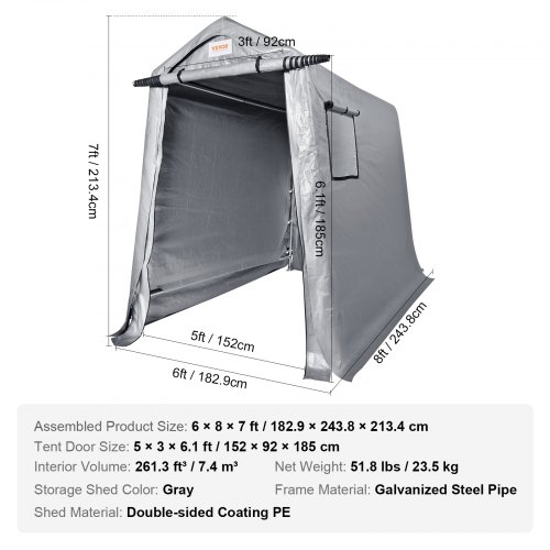 VEVOR Capannone Portatile per Stoccaggio Esterno, 183 x 244 x 213 cm Tenda per Stoccaggio Istantaneo per Tutte Le Stagioni Resistente con Porta con Cerniera arrotolabile e Finestre Ventilate per Moto, Bici,