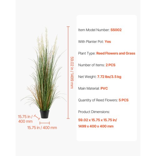 VEVOR Erba Artificiale, Confezione da 2 Erba Artificiale in Vaso 1499 mm, Pianta Finta Fiori di Canna ed Erba per Interni ed Esterni, Casa, Giardino, Ufficio, Decorazione per Casa Ristorante, Verde