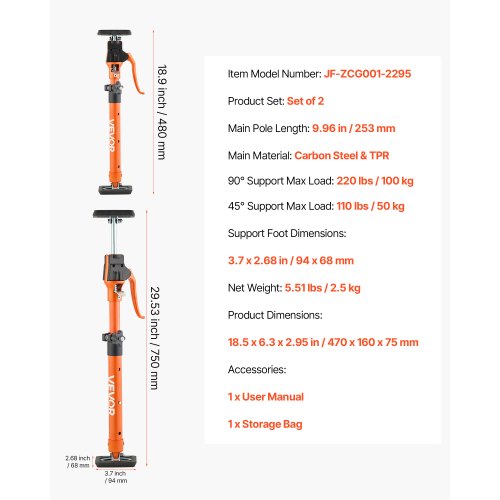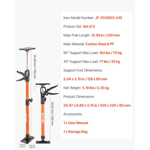 VEVOR Asta di Supporto per Martinetto, 2 Pezzi, Asta di Supporto Rapido Telescopica in Acciaio da 48 a 75 cm, Sistema Regolabile a 3 Mani con Capacità 100 kg per Sollevamento di Cartongesso