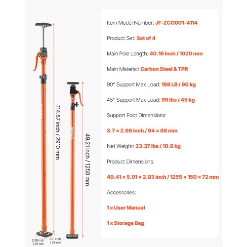 VEVOR Asta di Supporto per Martinetto, 4 Pezzi, Asta di Supporto Rapido Telescopica in Acciaio da 125-291 cm, Sistema Regolabile a 3 Mani con Capacità 90 kg per Sollevamento di Cartongesso