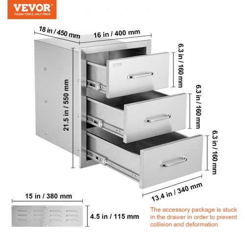 VEVOR Cassettiera Cassetto Tre Piani a Filo, 15,7 x 28,5 x 20,5 Pollici Cassetti da Cucina per Esterni d'Argento in Acciaio Inossidabile, Usato nella Cucina all'Aperto, Come Stoviglie, nell'Armadietto