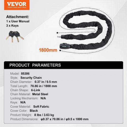 VEVOR Lucchetto a Catena per Bicicletta, Lucchetto a Catena per Bicicletta di Sicurezza Lunghezza 1800 mm, Lucchetto Antifurto Sicurezza in Acciaio per Bici, Motociclette, Scooter, Porte, Recinzioni