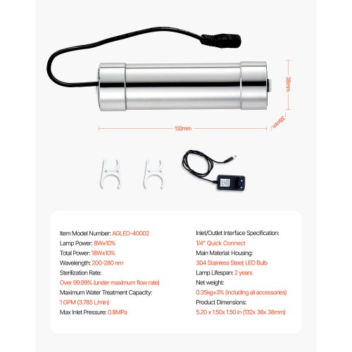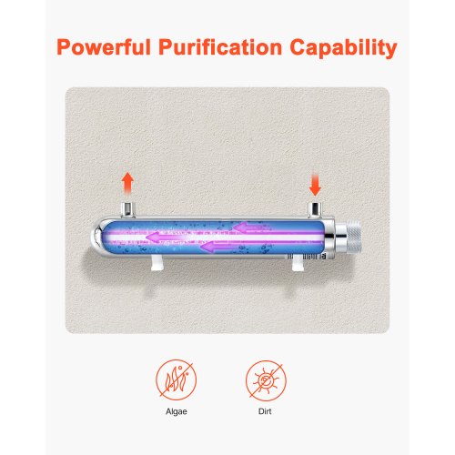 VEVOR Purificatore d'Acqua UV, 8 W 3,785 L/min Filtro Purificatore d'Acqua Ultravioletto Versatile 220 V con Alloggiamento in Acciaio Inox, per Tutta Casa con Manicotto al Quarzo, per Bere, Pulizia