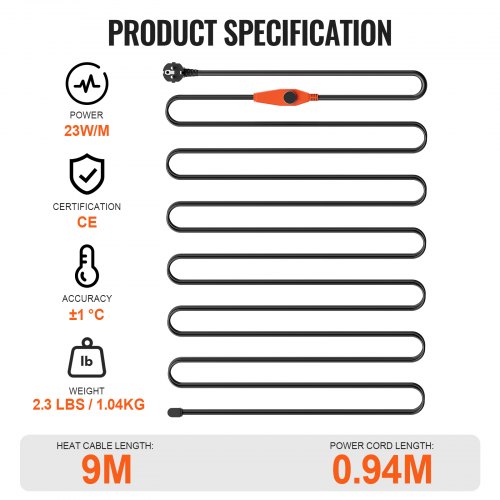 VEVOR Cavo Riscaldante per Tubi Lunghezza da 9m 23 W/m per Tubi con Termostato Integrato, Cavo Riscaldante per Tubi dell'Acqua Protezione Tubi in PVC, Tubi in Metallo e Plastica dal Congelamento