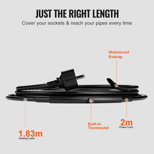 VEVOR Cavo Riscaldante per Tubi Autoregolante Lunghezza 1,83m 16,4 W/m per Tubi Termostato Integrato, Cavo Riscaldante per Tubi Acqua Protezione Tubi in PVC, Tubi in Metallo Plastica dal Congelamento