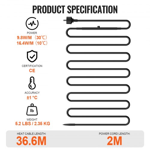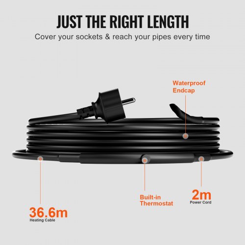 VEVOR Cavo Riscaldante per Tubi Autoregolante Lunghezza 36,6m 16,4 W/m per Tubi Termostato Integrato, Cavo Riscaldante per Tubi Acqua Protezione Tubi in PVC, Tubi in Metallo Plastica dal Congelamento