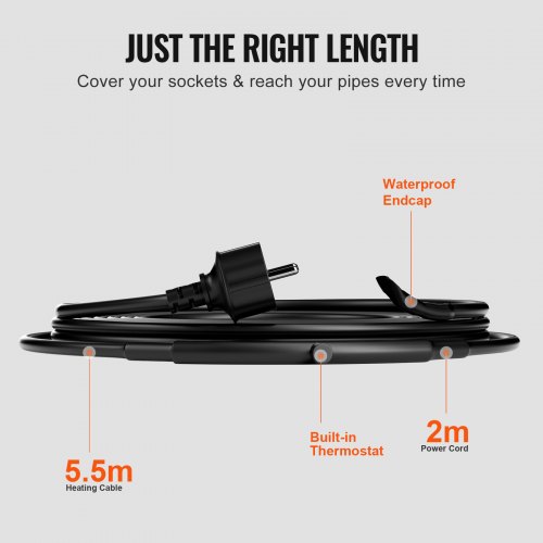 VEVOR Cavo Riscaldante per Tubi Autoregolante Lunghezza 5,5m 16,4 W/m per Tubi Termostato Integrato, Cavo Riscaldante per Tubi Acqua Protezione Tubi in PVC, Tubi in Metallo Plastica dal Congelamento