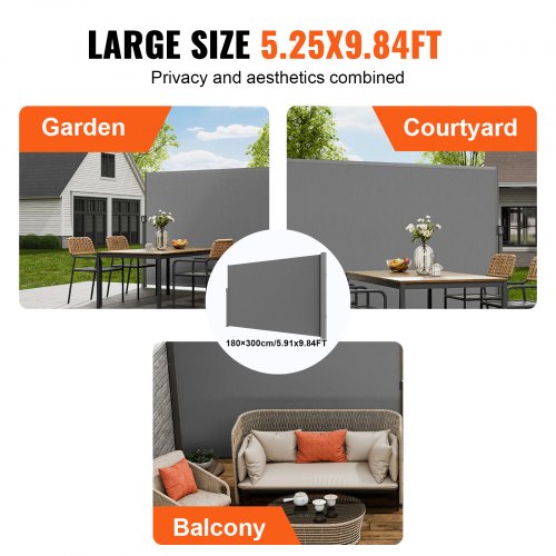 VEVOR Tenda Laterale Retrattile, Schermo Privacy Esterno Giardino Balcone Terrazza 180x300 cm, Frangivista Retrattile Poliestere 180g Impermeabile, UV30+ Paravento Divisorio per Cortile Balcone Grigio