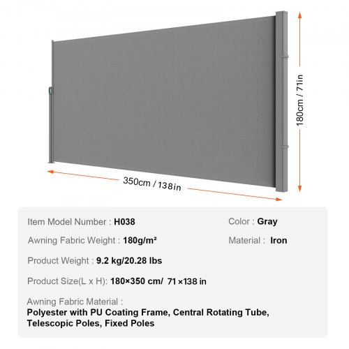 VEVOR Tenda Laterale Retrattile, Schermo Privacy Esterno Giardino Balcone Terrazza 180x350 cm, Frangivista Retrattile Poliestere 180g Impermeabile, UV30+ Paravento Divisorio per Cortile Balcone Grigio
