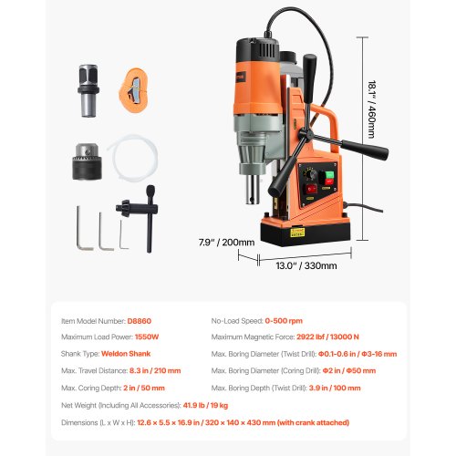 VEVOR Trapano a Colona Magnetico Velocità tra 0-810 giri/min Portatile 220V-240V 50/60Hz 1300W, Trapano Magnetico Diametro di Perforazione Max. 40mm Profondità Max. 50mm Forza Magnetica Fino a 13000N