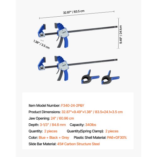 VEVOR Morsetti a Barra per Lavorazione Legno 2 Pezzi, Apertura 60,96 cm, Morsetto a F Bloccabile Carico max. 154 kg, Profondità 84,6 mm, in Acciaio al Carbonio Set di Morsetto da Falegname