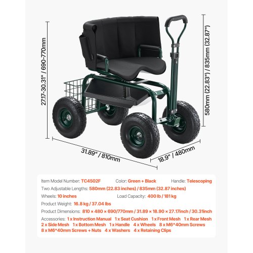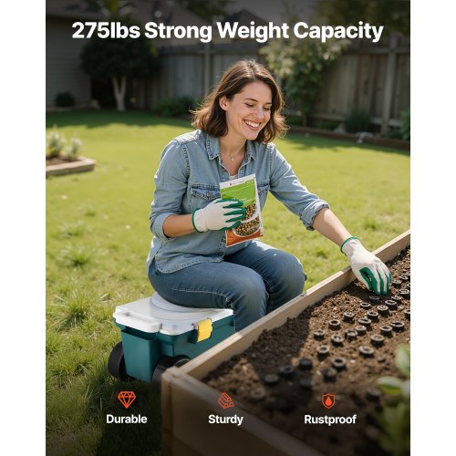 VEVOR Carrello da Giardino con Ruote Portaoggetti Portautensili, Carico max. 136 kg, Sedile da Lavoro Carrello per Giardinaggio, Tosaerba, Piantagione, Sedile 450 x 370 mm Girevole 360°