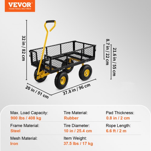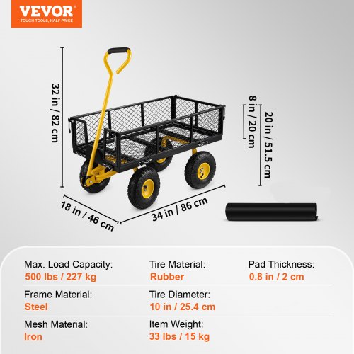 VEVOR Carrello da Giardino in Acciaio 226,8 kg Carrello da Giardino per Impieghi Gravosi Trainabile su Ruote, Carrello Giardino in Metallo, Pneumatici 254 mm per Tutti Terreni, Lati Rimovibili in Rete