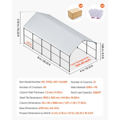 VEVOR Carport in Metallo per Impieghi Gravosi 4x8x3,15 m con Struttura e Tetto in Acciaio Zincato, Tenda da Garage Pareti Laterali Rimovibili, Ricovero per Auto Multiuso per Pick-up, Barca,Trattori