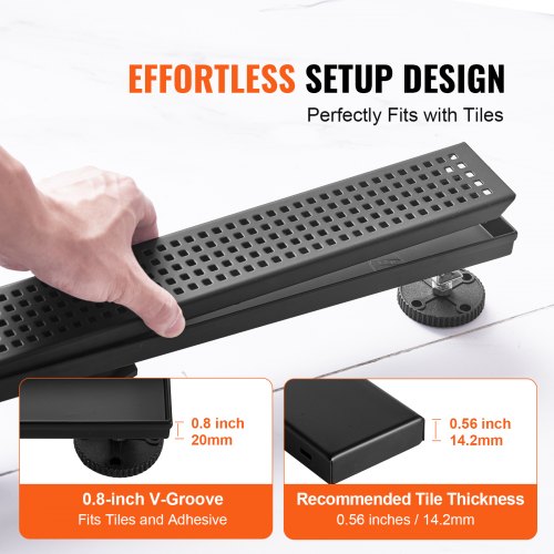 VEVOR Scarico per Doccia Lineare da 24 Pollici con Griglia a Motivo Quadrato, Scarico a Pavimento per Doccia Rettangolare in Acciaio Inossidabile 304 Spazzolato Nero Opaco