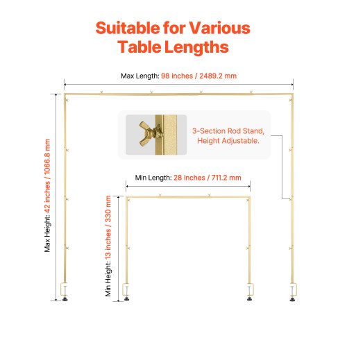 VEVOR Supporto da Tavolo con Morsetti, Altezza ca. 33-107 cm e Lunghezza Regolabile ca. 71-248 cm, Supporto da Tavolo in Metallo, Struttura ad Arco per Palloncini per Matrimoni Natale, Oro 2 Pezzi