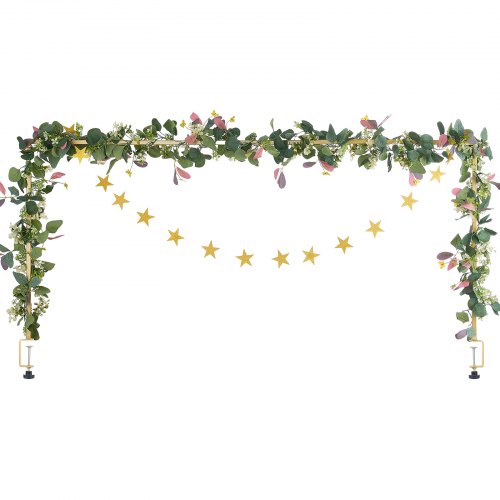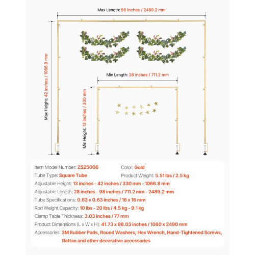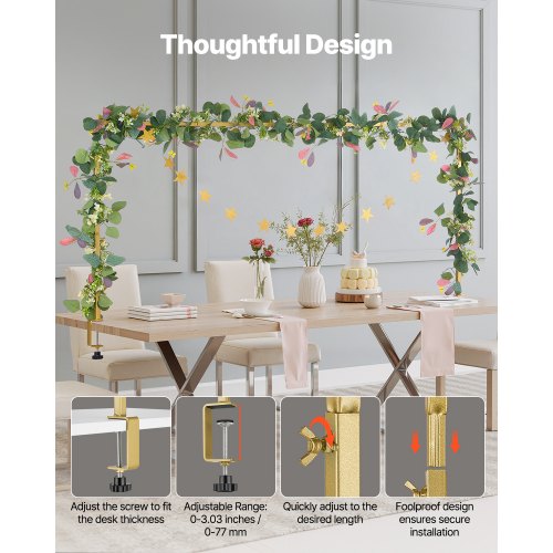 VEVOR Supporto da Tavolo con Morsetti, Altezza ca. 33-107 cm e Lunghezza Regolabile ca. 71-248 cm, Supporto Tavolo in Metallo con Rattan, Struttura ad Arco per Palloncini Matrimoni Natale, Oro