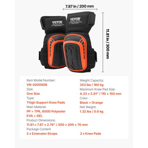 VEVOR Ginocchiere Estese per Lavori Pesanti con 2 Cinghie di Estensione, Ginocchiere in Gel di Schiuma Antiscivolo, per Uomini e Donne, per Giardinaggio, Pavimenti, Coperture e Pulizia, Nero Arancione