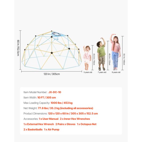 VEVOR Struttura da Arrampicata Geometrica a Cupola Larghezza 305 cm con Palloni da Basket, Carico 453 kg, Attrezzatura da Arrampicata per Bambini dai 3 ai 10 Anni, Parco Giochi Giardino