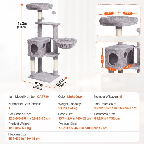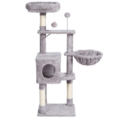VEVOR Tiragraffi per Gatti Interno 115 cm Torre per Gatti con Cuccia per Gatti, Amaca, Trespolo Superiore, Piattaforme per Salti, con Palla Appesa, Centro Attività per Mobili per Gatti, Grigio Chiaro
