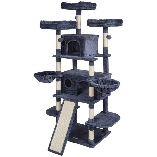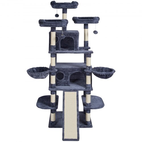 VEVOR Tiragraffi per Gatti da Interno, Torre per Gatti 183 cm 2 Cucce per Gatti, Trespolo Superiore, Piattaforme per Salti, Grande Centro Attività per Mobili per Gatti con Palla Appesa, Grigio Scuro