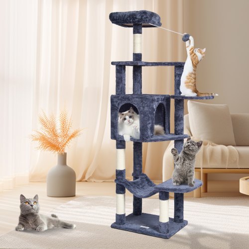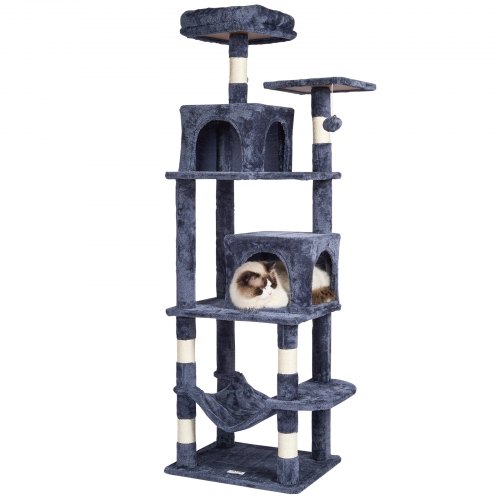 VEVOR Tiragraffi per Gatti da Interno 174 cm Torre per Gatti con 2 Cucce per Gatti, Amaca, Trespolo Superiore, Piattaforme per Saltare, Grande Centro Attività per Gatti con Palla Appesa, Grigio Scuro